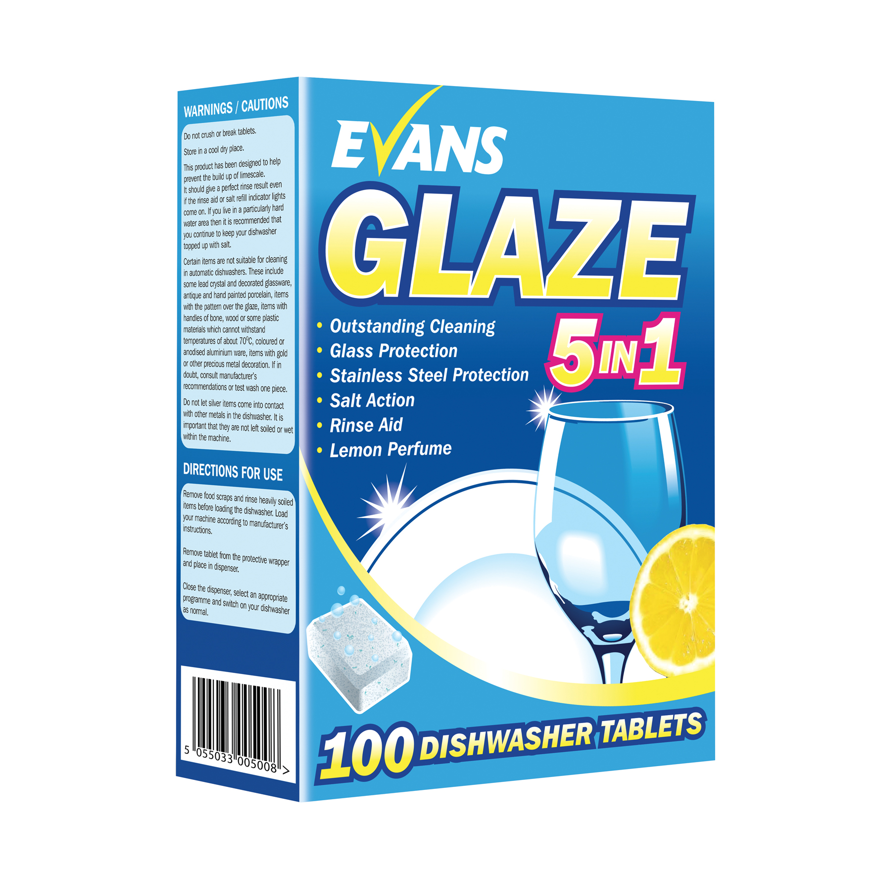 Evans Glaze 5in1 Dishwasher Tablets contain a new improved 5in1 action with a fresh lemon fragrance. Formulated to remove difficult foodstuffs and grease to ensure crockery, cutlery and glassware are left sparkling, clean and bright.