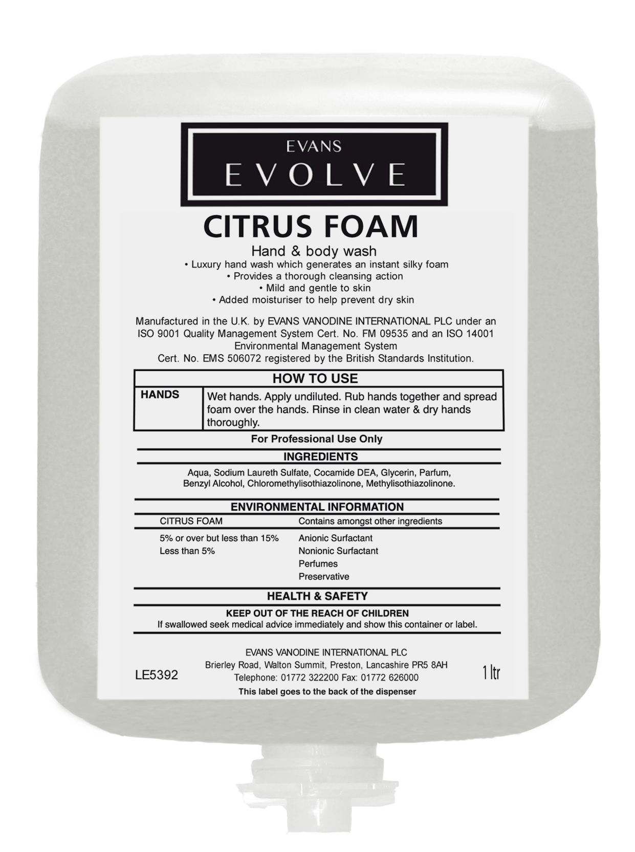 Evans Citrus Foam is a luxury hand and body wash which generates an instant soft and silky foam that provides a through cleansing action. Contains an invigorating perfume to refresh the hands and body along with moisturising properties to help protect the skin against dryness.