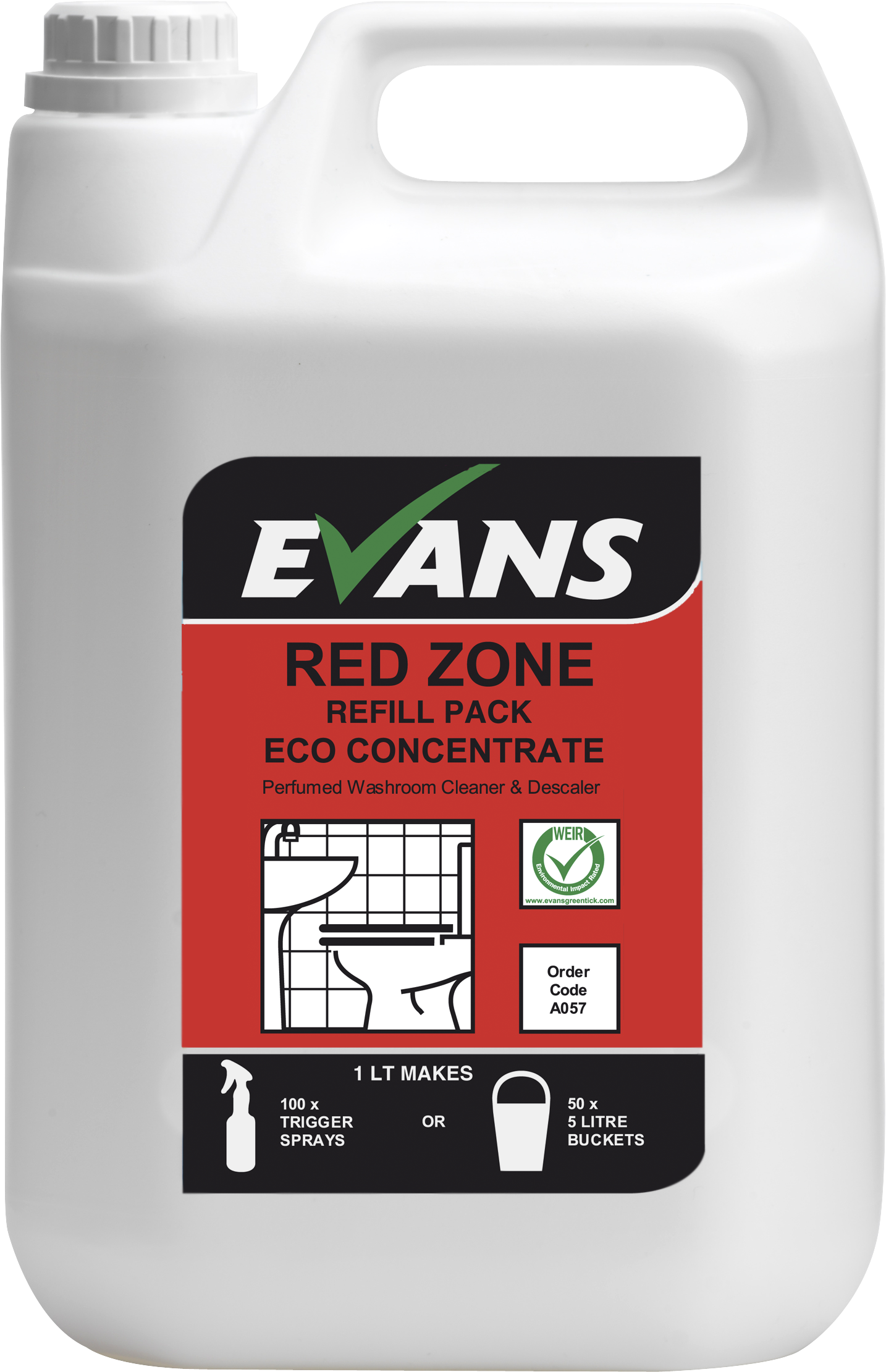 Evans Red Zone Eco Concentrate is a highly concentrated washroom cleaner and descaler. The product has a colour coded formulation and if for the daily and general cleaning of all washbasins, baths, showers, toilets and tiles. It is suitable for use on porcelian, stainless steel, chrome and ceramic.