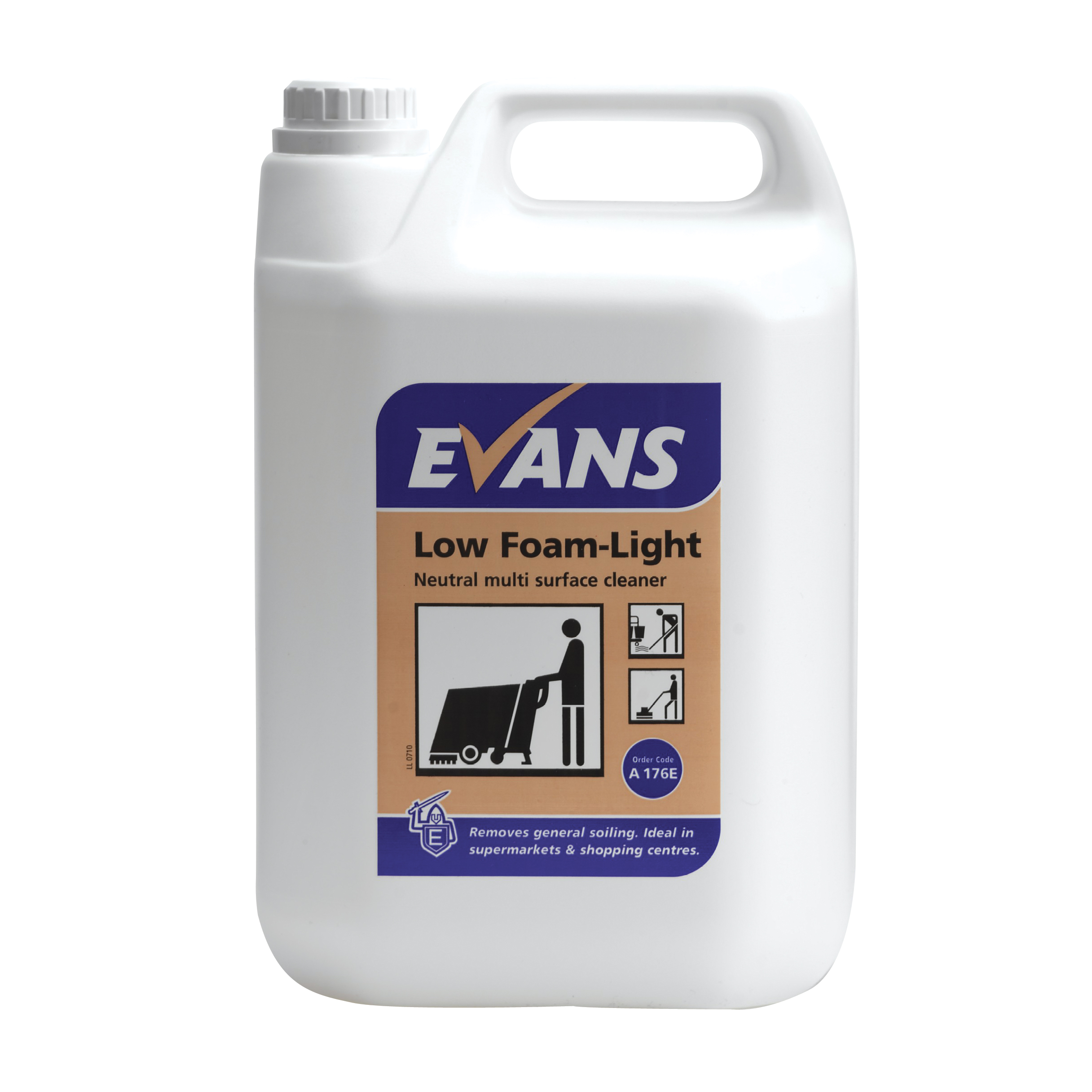 Evans Low Foam Light is a multi-surface, low foaming neutral cleaner, for use in a combination scrubber dryer floor machine. For cleaning a variety of floor surfaces including vinyl, rubber, ceramic, terrazzo, marble, sealed wood and cork and all polished floors. May also be used for the general mopping of lightly soiled floors.
