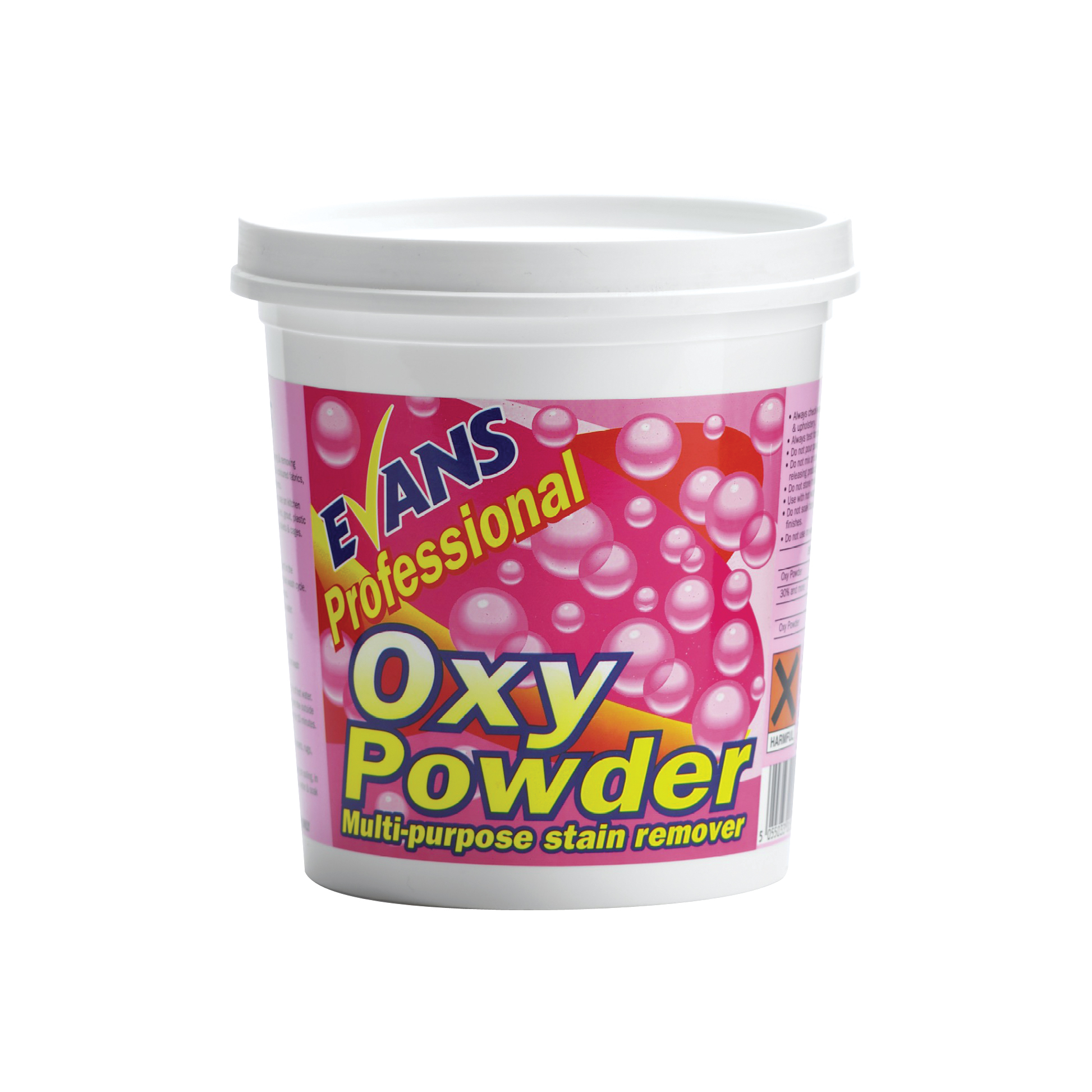 Evans Oxy Powder is a highly effective, multi purpose powder for cleaning and removing stains, grease, mould and heavy soiling from white and coloured fabrics, upholstery and carpets. It is extremely versatile, as it is also suitable for use on kitchen worktops, chopping boards, toiles, paving stones, grout, plastic, garden furniture, rubbish bins and even animal baskets and cages.