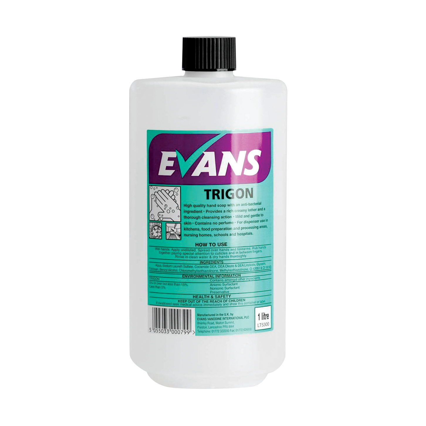 Evans Trigon is a high quality unperfumed hand wash with an anti-bacterial ingredient. Ideal for use in food preparation and processing areas, nursing homes, schools and hospitals. Ideal for use in all types of bulk fill soap dispensers and can also be effectively used to refill smaller pump dispensed hand wash bottles.