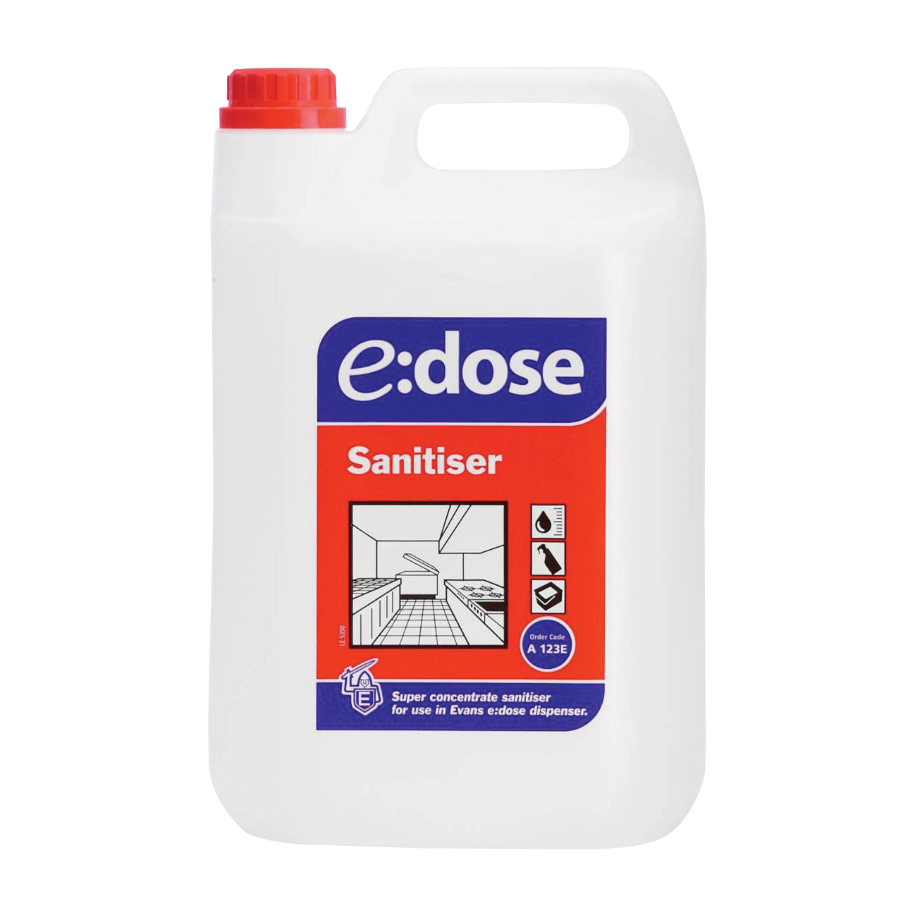 Evans e:dose Sanitiser is a highly active unperfumed cleaner and terminal disinfectant, for use in conjunction with the Evans e:dose dispenser. Kills a range of bacteria and viruses and removes general soil from all washable hard surfaces and equipment. Formulated especially for use in kitchens and wherever food is handled or prepared. Passes EN1276 .